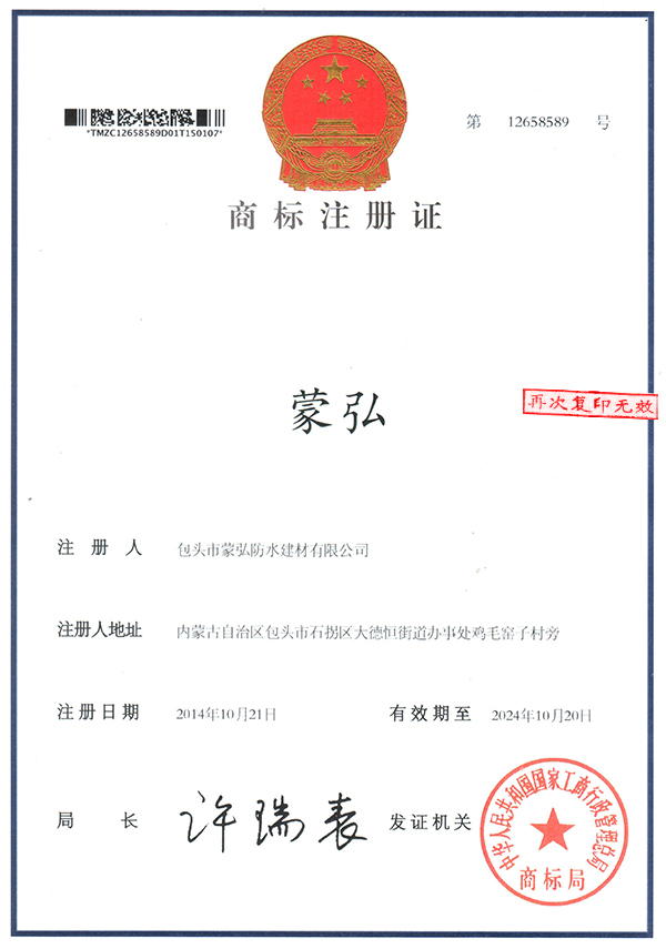 蒙弘防水建材商標注冊證